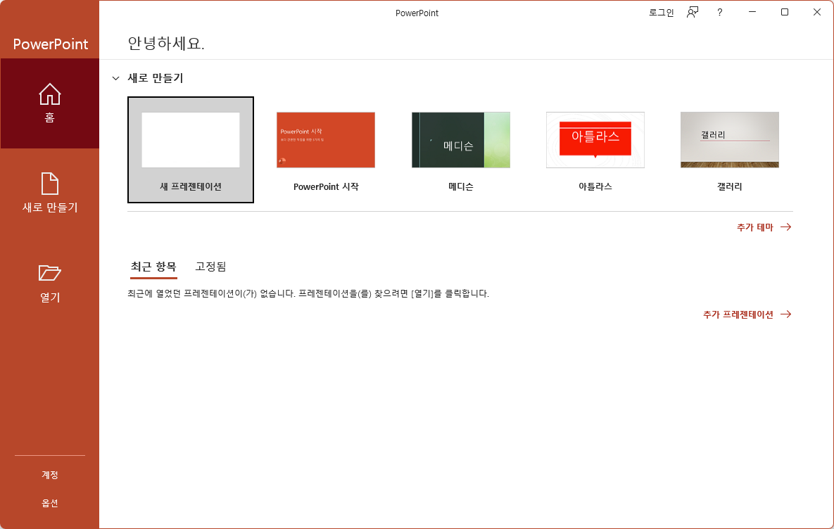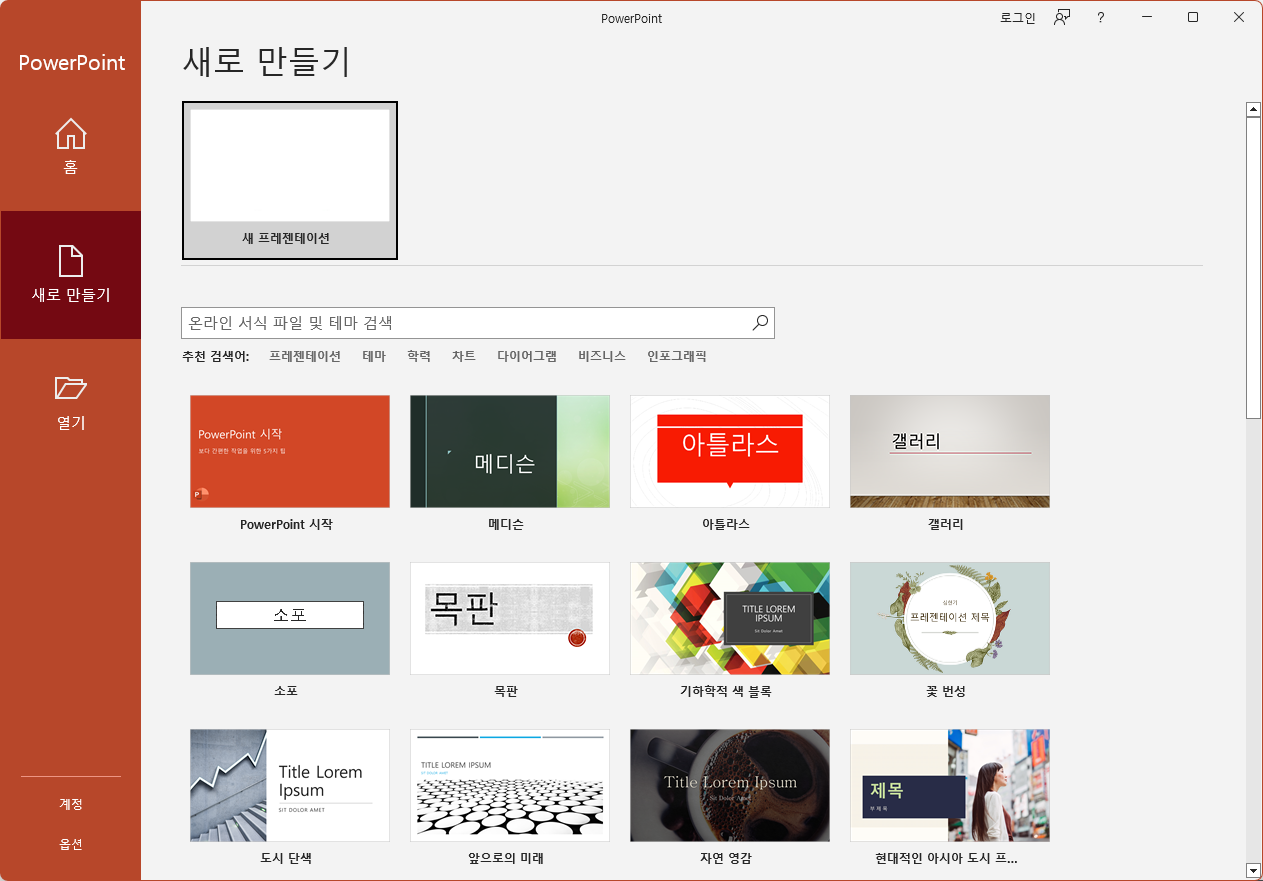 새로 만들기 추가 테마를 이용해서 양식을 선택하고 문서를 작성할 수 있으며 새 프레젠테이션으로 시작할 수 있다.