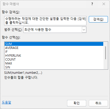 함수 마법사에서 사용가능한 함수를 선택할 수 있으며 사용 방법을 확인할 수 있다.