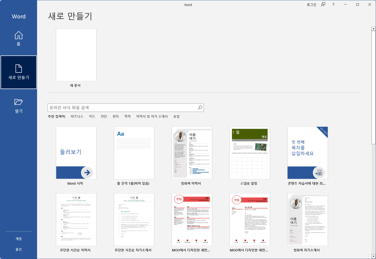 새로 만들기 추가 서식 파일을 이용해서 양식을 선택해서 문서를 작성할 수 있으며 새문서로 시작할 수도 있다.