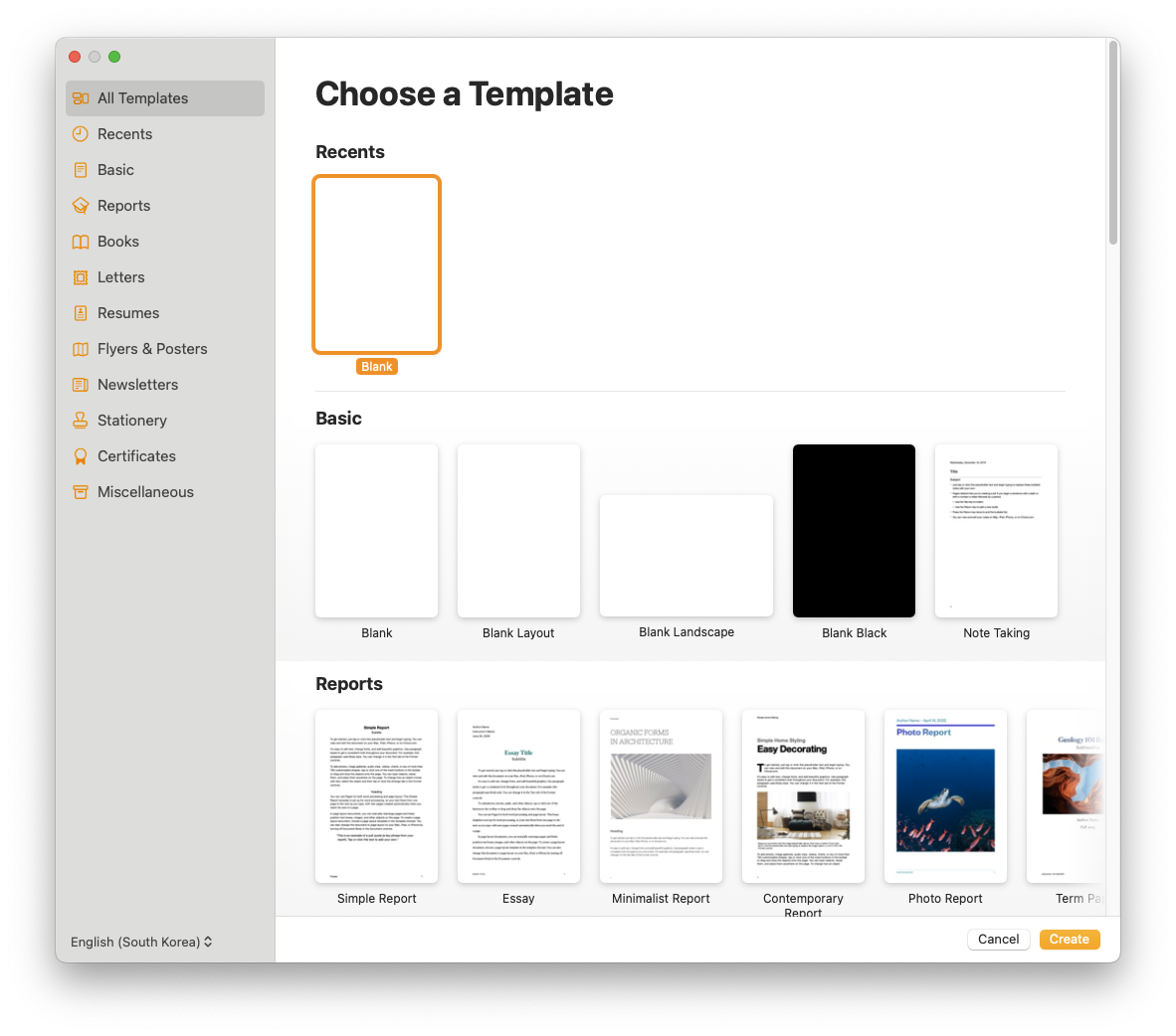 최근문서(Recents), 기본(Basic), 리포트(Reports) 양식 등이 있으므로 본인이 작성하는 문서에 맞게 활용해 보자.