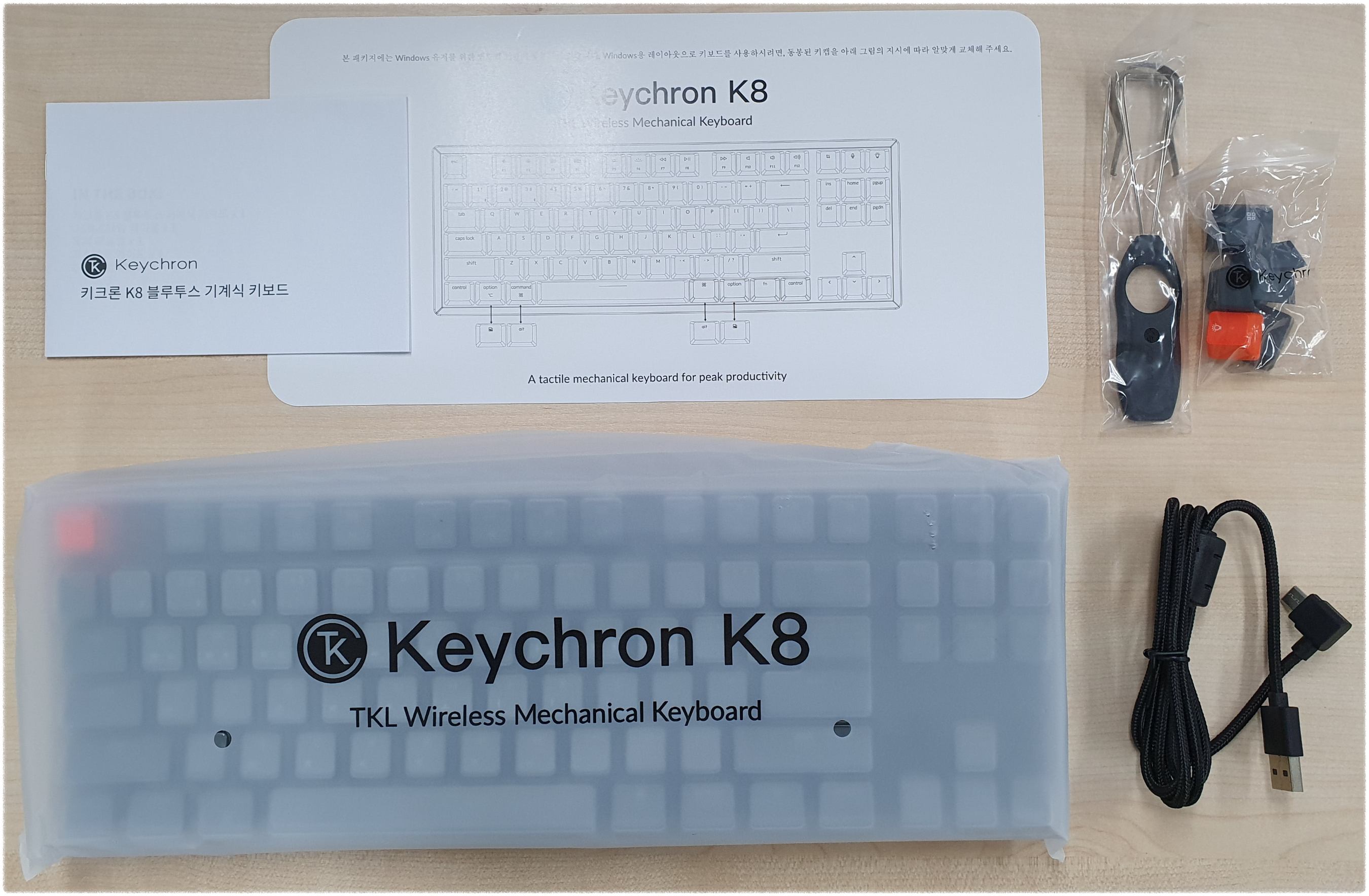 키크론(KEYCHRON) K8 기계식 키보드는 87키로 맥(MAC),윈도우(WINDOWS) 기능키를 포함한 제품이다.유선, 무선 블루투스 방법으로 연결가능하며 87키로 가로길이가 짧은 편이라 휴대하기에도 편리하다.제품 박스 개봉 시 키보드 키 교체 관련 설명서가 들어 있으며 좌측에 키보드, 우측에 부가품목이 들어 있다.기본적으로 유선 연결 케이블로 컴퓨터,노트북과 연결해서 사용가능하며 무선 블루투스를 지원한다.키보드 키 교체 관련 장비가 포함되어 있으므로 필요시에 사용가능하다.키보드 키가 87키라서 꼭 필요한 키만 있을 거라 생각이 들고 좌측 하단에 맥(MAC) 관련 키가 기본 탑재되어 있다.키크론 K8 키보드가 조금 높은 편이라 K8 전용 손목 보호대를 추가로 구매가능하면 키보드 사용에 편리할 것 같다.