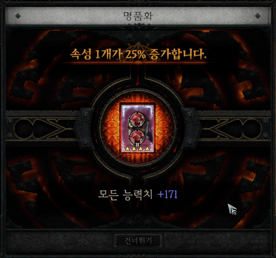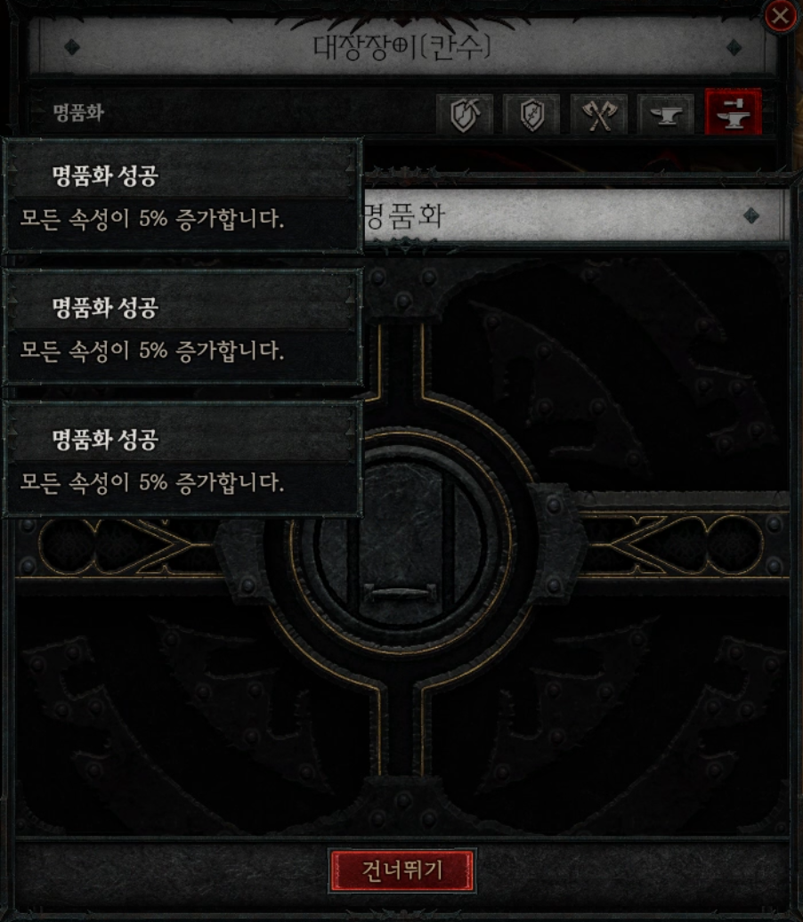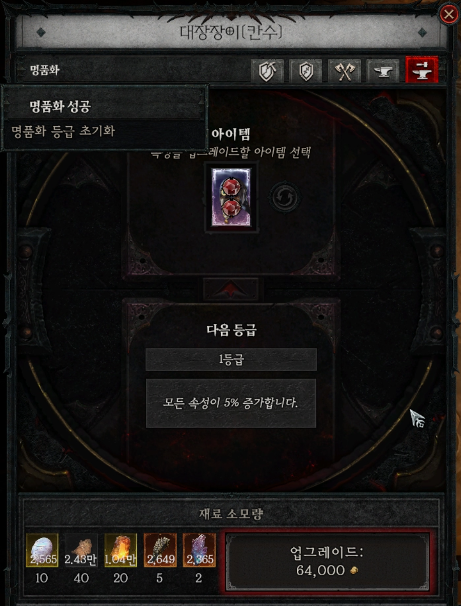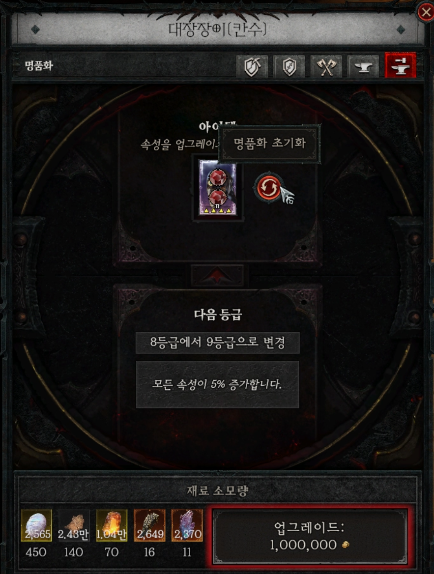 기존 명품화 작업한 속성이 초기화되어 명품화 진행을 1등급부터 시작할 수 있다.