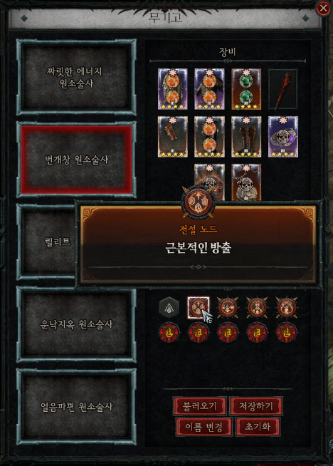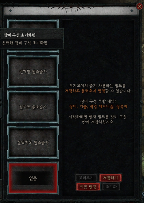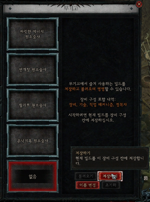 무기고에서 즐겨 사용하는 빌드를 저장하고 불러오며 명명할 수 있습니다.