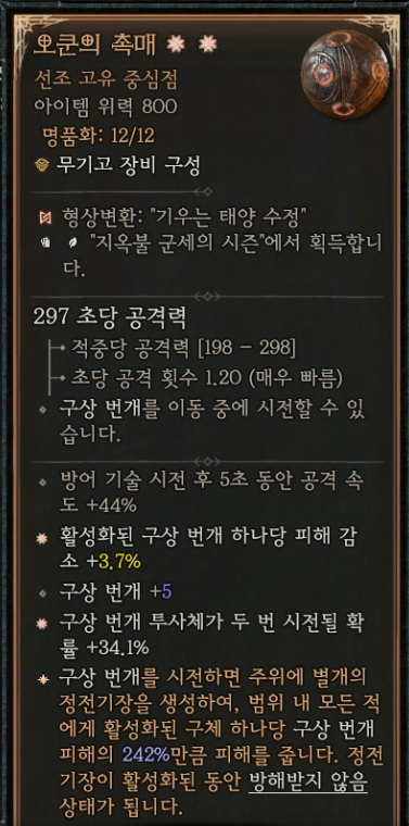 시즌10에서 추가된 전류의 남동석 반지의 번개 피해 증가와 오쿤의 촉매 중심점의 구상번개 피해 증가를 활용한다.