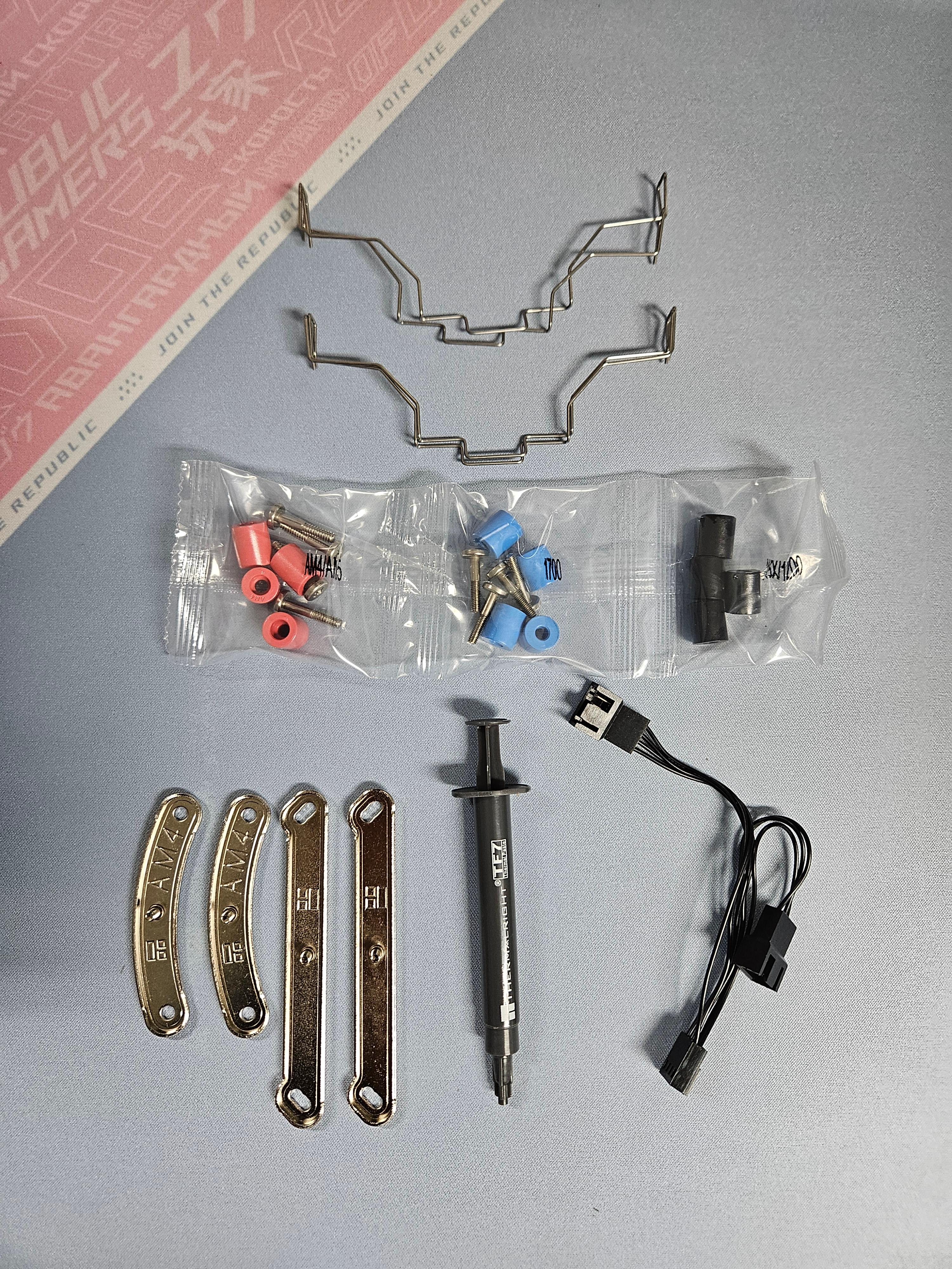 제품 구성은 히트싱크 1개, 120MM 팬 2개, 사용설명서, INTEL&AMD CPU용 설치 부품, 써멀 페이스트(써멀 그리스) 1개가 있다.