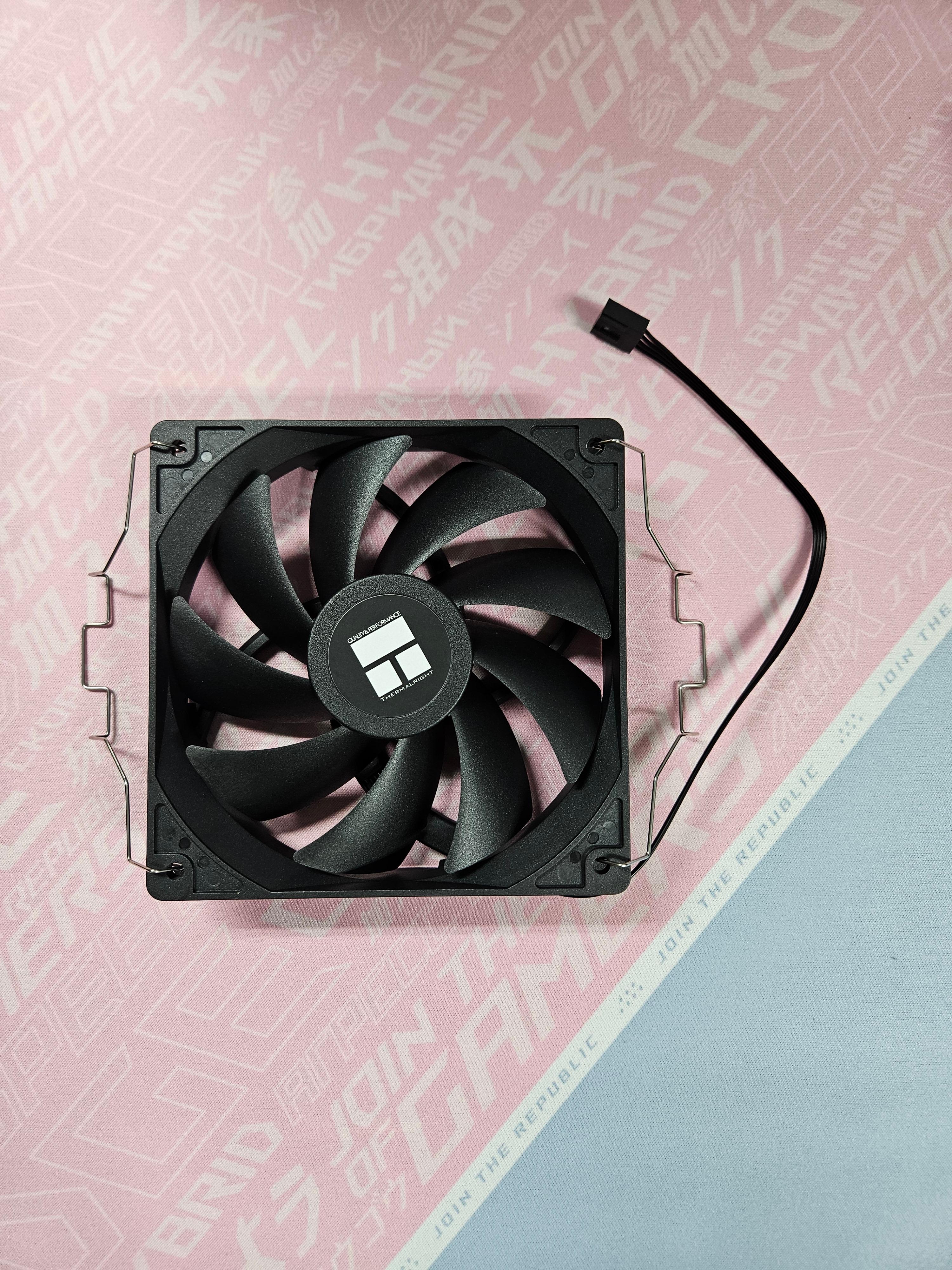 히트싱크에 장착할 120MM 팬 2개를 공기 순환 방향에 맞게 고리를 끼운다.