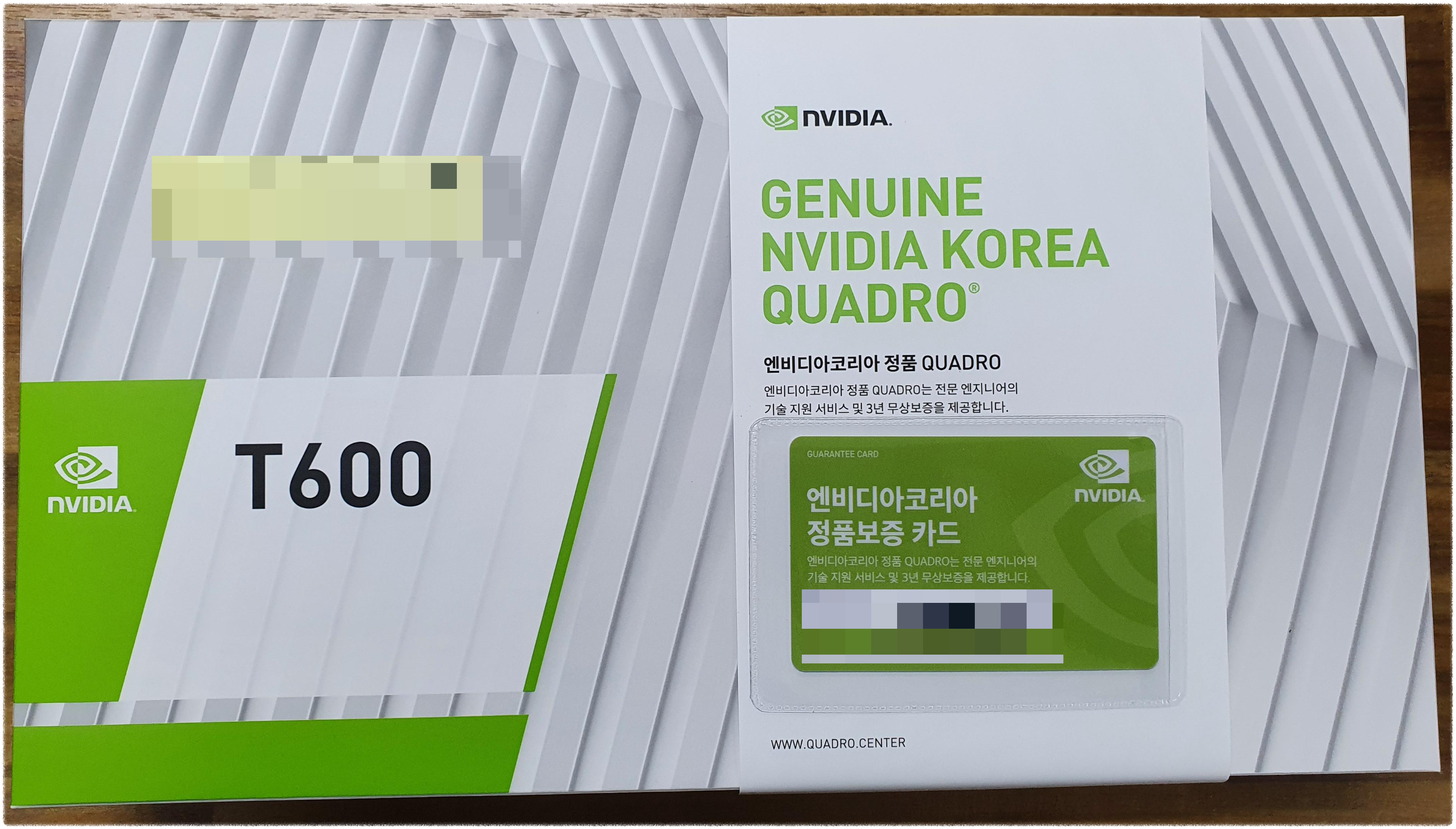 NVIDIA 쿼드로 T600 그래픽카드 구매시 엔비디아코리아 정품보증 카드를 제공하고 있다.