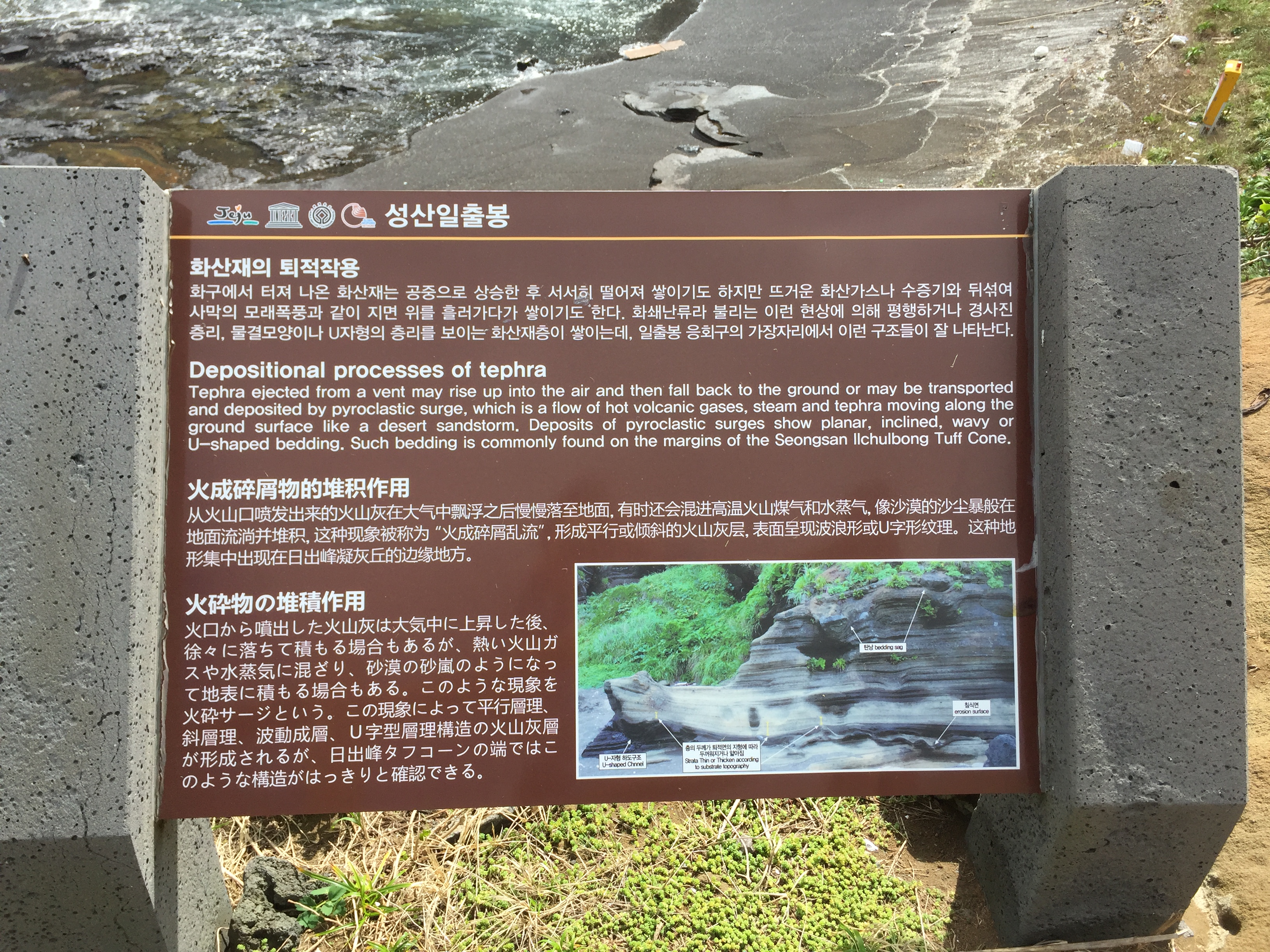 해발 180m인 성산 일출봉은 약 5,000년 전 제주도 수많은 분화구 중에서는 드물게 바닷속에서 수중폭발한 화산체이다. 용암이 물에 섞일 때 일어나는 폭발로 용안은 고운 화산재로 부서져 분화구 둘레에 원뿔형으로 쌓여 있다.
