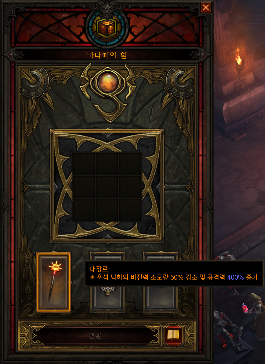 카나이의 함은 운석 낙하의 공격력을 높이는 대장로, 운석 소나기 효과의 황혼의 가면, 세트 아이템 개수 1개 감소할 수 있는 왕실 권위의 반지 아이템을 추천한다.