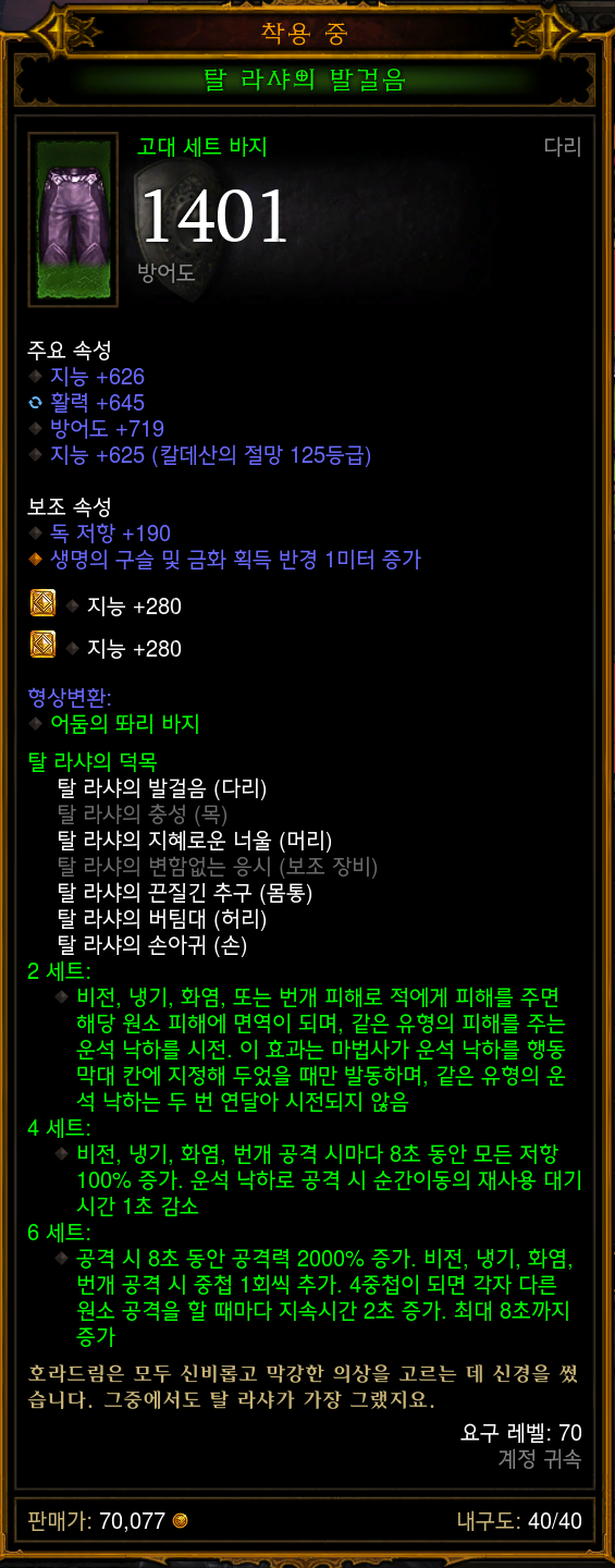 탈 라샤의 덕목 세트 아이템 6세트 효과까지 적용될 수 있게 착용한다.