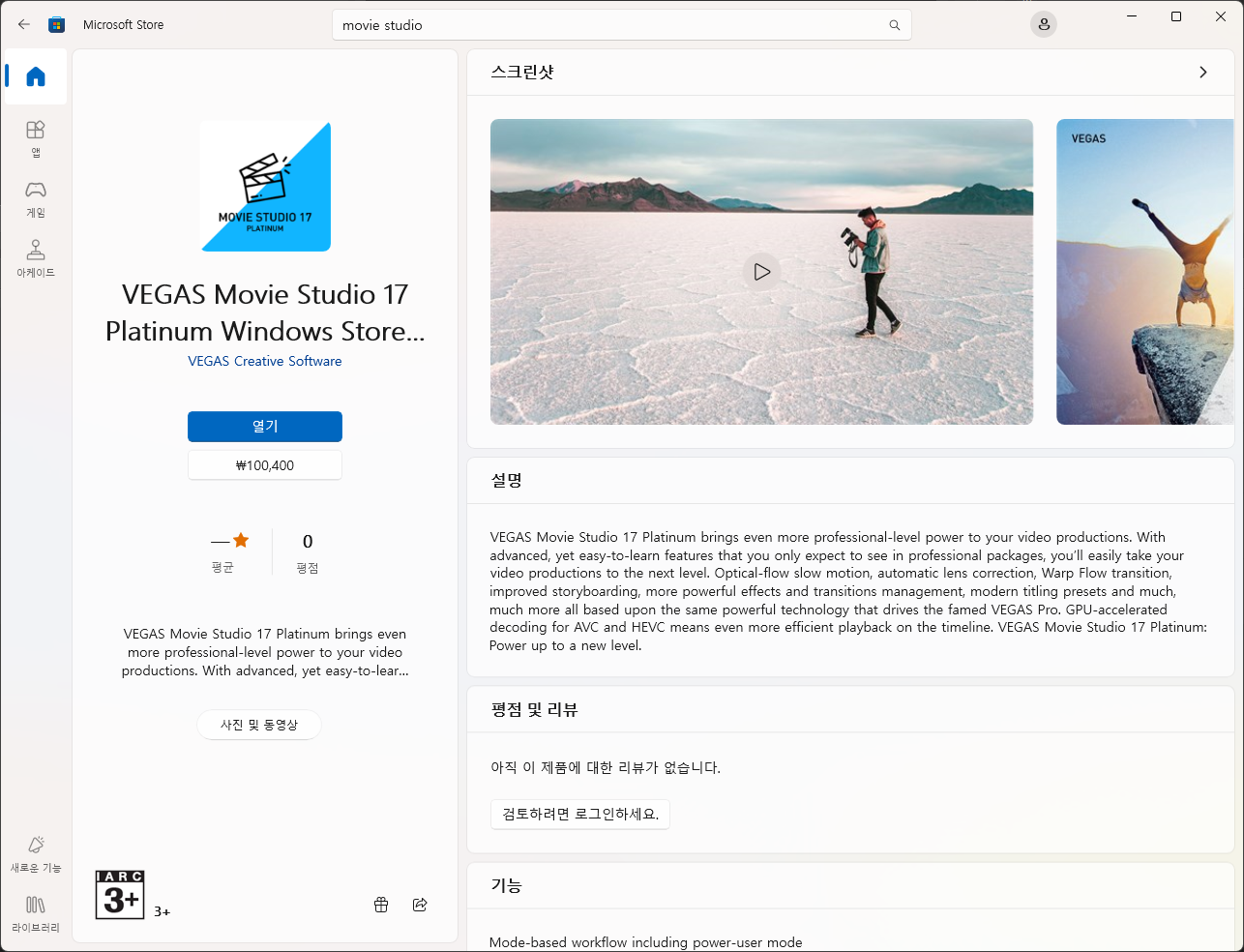 마이크로소프트 스토어(Microsoft Store)에서 Vegas Movie Studio Platinum 17, 18 Windows Store Edition을 구매해서 설치할 수 있다. Vegas Movie Studio 17 버전과 18 버전의 가격차이가 있으므로 설명, 기능 내용을 참고하자.
