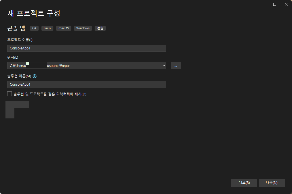 새 프로젝트 구성 화면에서 프로젝트 이름을 지정하고 위치, 솔루션 이름을 확인한다.