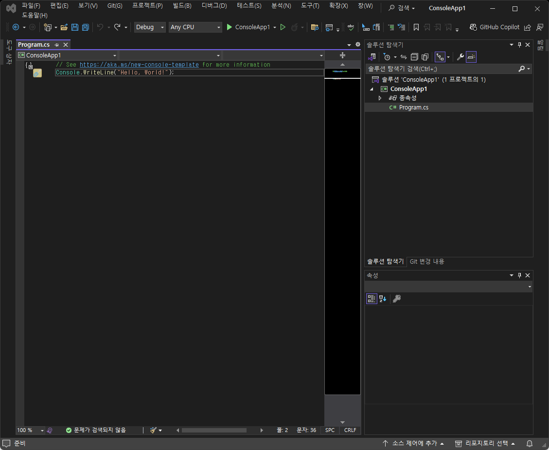 Visual Studio 2022 콘솔 앱으로 "Hello, World!" 출력 예제